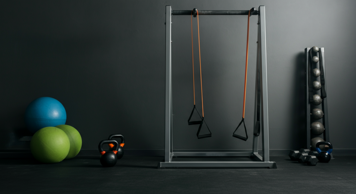 Élastiques de résistance (25-40 euros) : 5 résistances différentes. Reproduisent quasiment tous les exercices. Zéro place, silencieux.